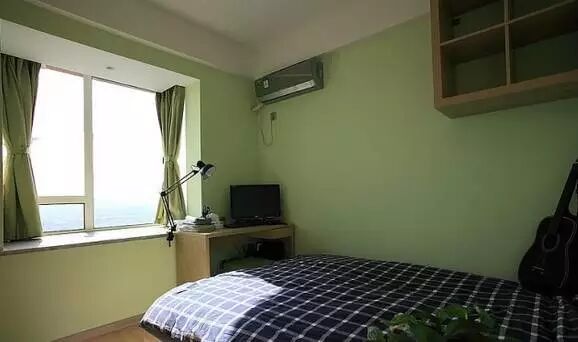 次卧的风格一改黑白灰的主色调,来了个彻底小清新,连窗帘都是苹果绿,竟然很养眼。